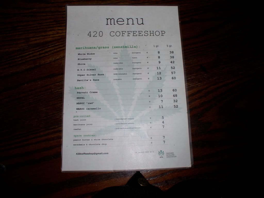 We wake up Thursday with nothing in particular planned and enjoy a red cherry berry wake up spliff before heading over to Hill St on the Markt. Armed with Amsterdam's strongest coffee Richie sits down with us to chat. At this point TOTALLY cool and we're wondering why we questioned him in the first place! Smoking left over hashish we wrap up our session (returning our cups to the counter as always - only once or twice have we not bussed our own table) and get ready to drop the keys off at the Greenhouse Effect hotel desk and pick up our new ones. We head down towards the centrum and try to absorb all the sights and smells knowing we're leaving in about 24 hours and pop into the GE hotel.
